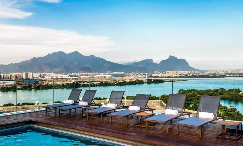 Além da proximidade com o Riocentro, o hotel conta com fácil acesso ao transporte público, com uma estação de BRT em frente que se conecta à malha metroviária da cidade. São 306 apartamentos amplos — alguns com varandas que evocam ondas suaves e vistas deslumbrantes para a lagoa e as montanhas da Zona Oeste.
