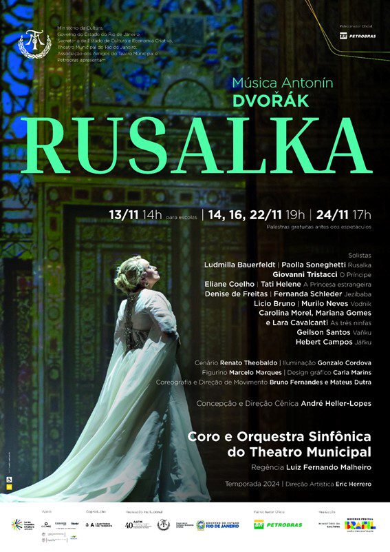 Pela primeira vez no palco do Theatro Municipal do Rio de Janeiro, a ópera Rusalka, de Antonín Dvořák, com Coro e Orquestra Sinfônica da casa, estreia no dia 14 de novembro (quinta), com récitas também nos dias 16/11(sábado) e 22/11(sexta), às 19h e 24/11(domingo), às 17h. Haverá ainda em 13/11, às 14h, o Projeto Escola Arte Educação Petrobras. A montagem é uma coprodução com o Auditório de Tenerife, na Espanha, país onde esteve em cartaz em março deste ano e agora, chega ao Municipal. A concepção e direção cênica é de André Heller-Lopes e a direção musical e regência ficam a cargo de Luiz Fernando Malheiro.